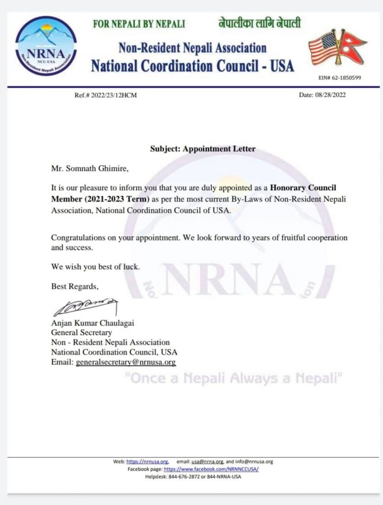 समाजसेवी घिमिरे ‘एनआएनए’ अमेरिकाको मानद परिषद सदस्यमा नियुक्त